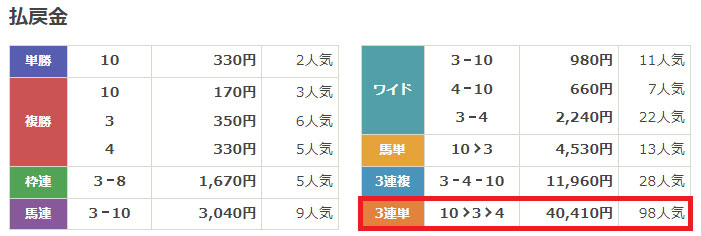 期待通り5.6番人気馬が2.3着に絡んだので3連単404.1倍の万馬券獲得です!