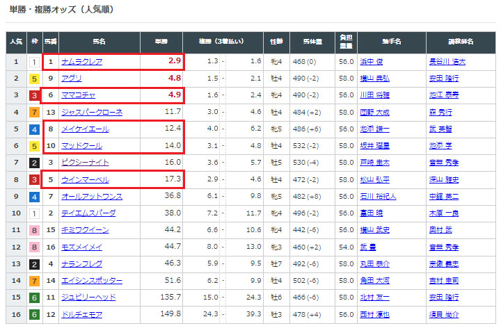 予想はワイドの5頭BOXで点数は10点になります。