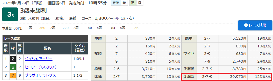 6月28日・小倉12レース 3歳以上1勝クラス 芝1200m
