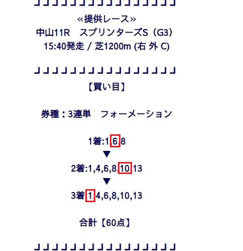1日(日)スプリンターズS(G1)で無料情報3連単171.4倍的中!