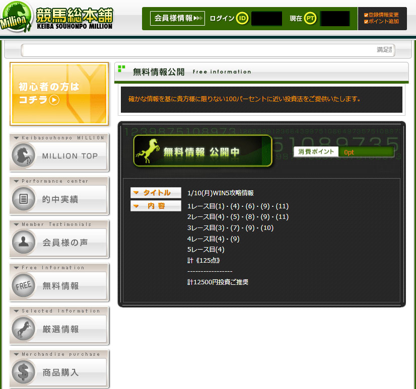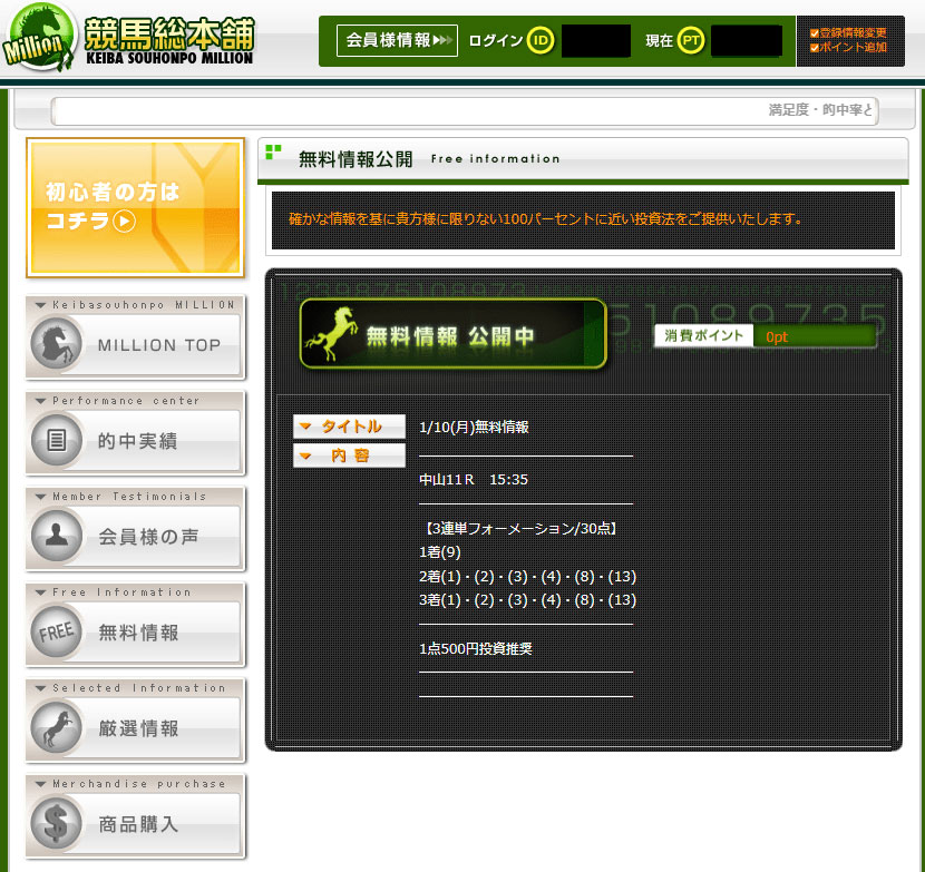 今回検証したのは競馬総本舗Millionという予想サイトの「無料情報」検証です。