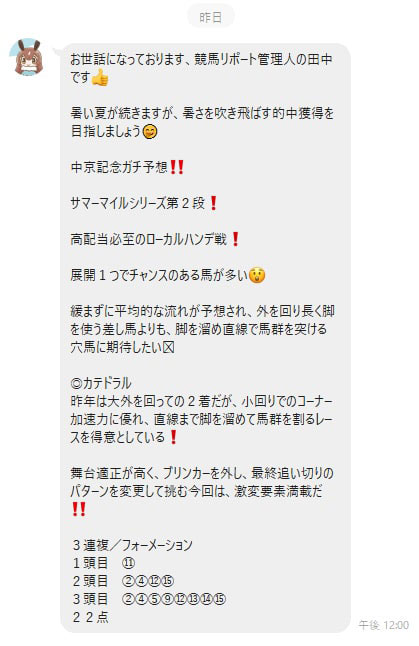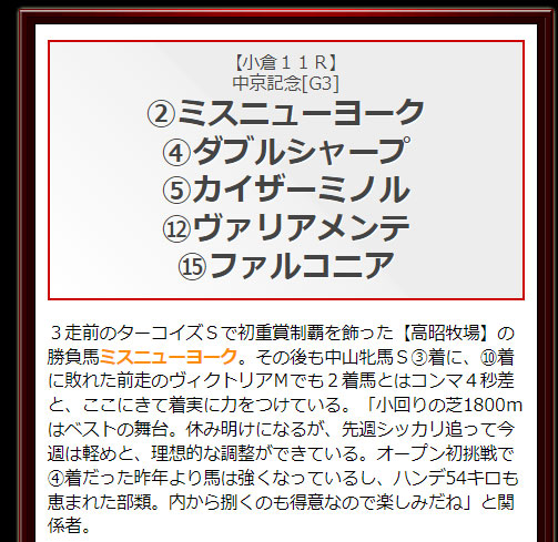 先週も好成績で今週も好成績、是非夏競馬攻略にお役立て下さい。