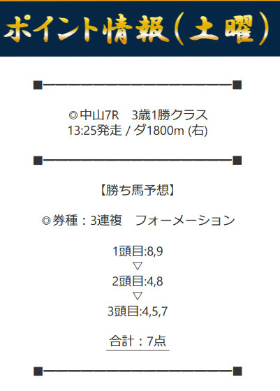 3連複フォーメーションの7点予想であるが、どれが軸馬なのかハッキリしない買い目である…