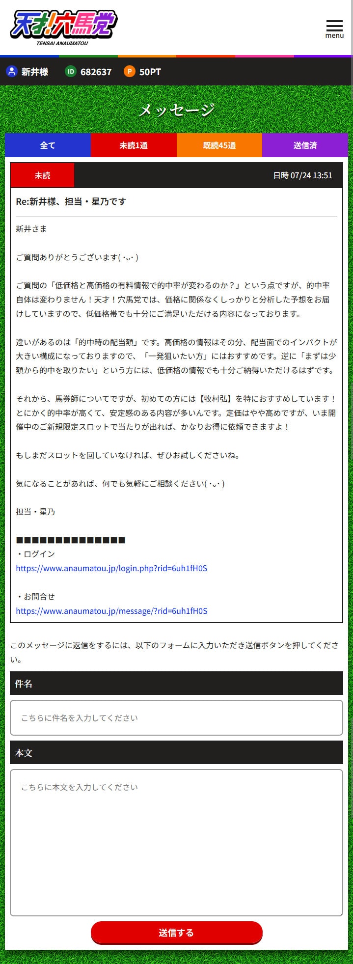 長らく競馬サイトの検証を行っていますがサポート対応が1時間以上、あるいは翌日対応などと、サポート対応に時間が掛かる予想サイトは基本的に悪評サイトの確立が高く、会員様1名1名丁重にサポートしている事が現段階で分かりました。