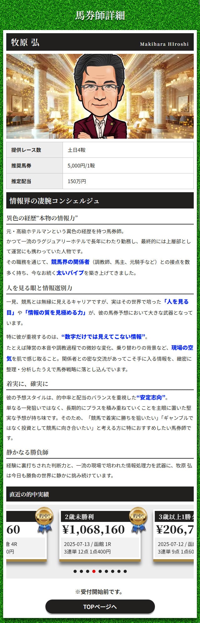 詳細を見ると、高級ホテルマンから脱サラ?して馬券師と異色の経歴を持つ牧原馬券師。