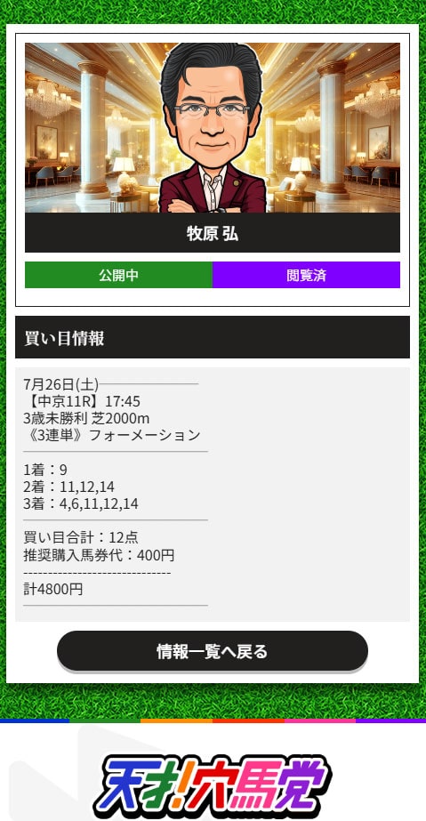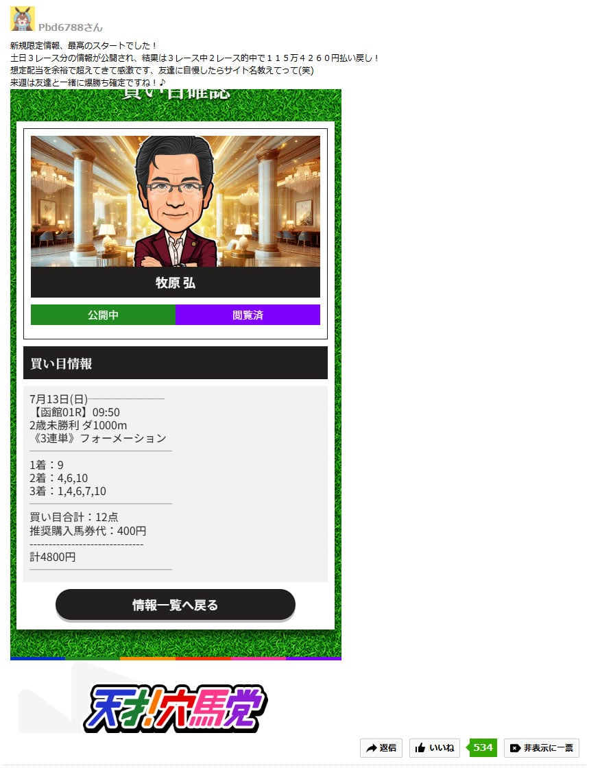 ※利用者の多い、「天才!穴馬党」競馬リポート内の口コミを確認たところ、会員様も直近で「牧原 弘」馬券師、有料情報を利用して100万円越え払い戻しの実績を残しており、これから検証する管理人の田中もですが利用者側から考えるとこういった的中報告は期待が高まりますね。