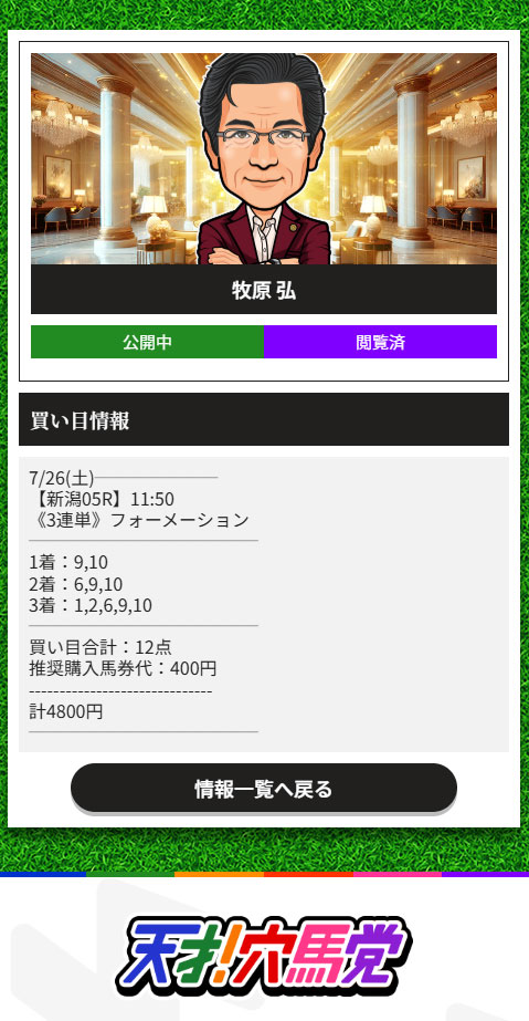 競馬関係者と「太いパイプ」を持つという事でネットやメディアに落ちない貴重な情報ルートを確保している馬券師とのこと。