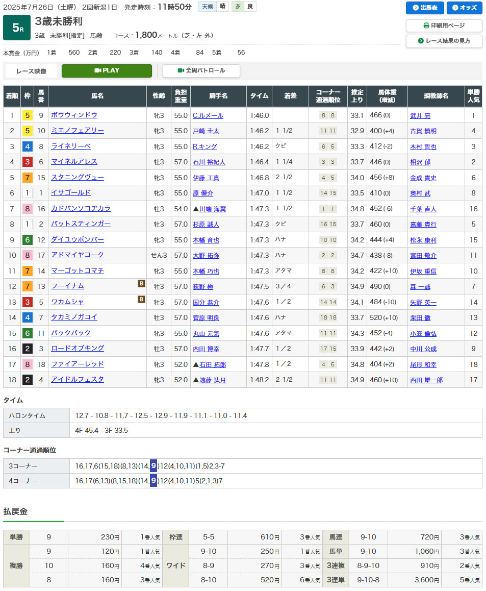 新潟5R結果はというと、1着・2着の予想通り⑨→⑩と続きましたが惜しくも3着に⑧を拾っておらず不的中。