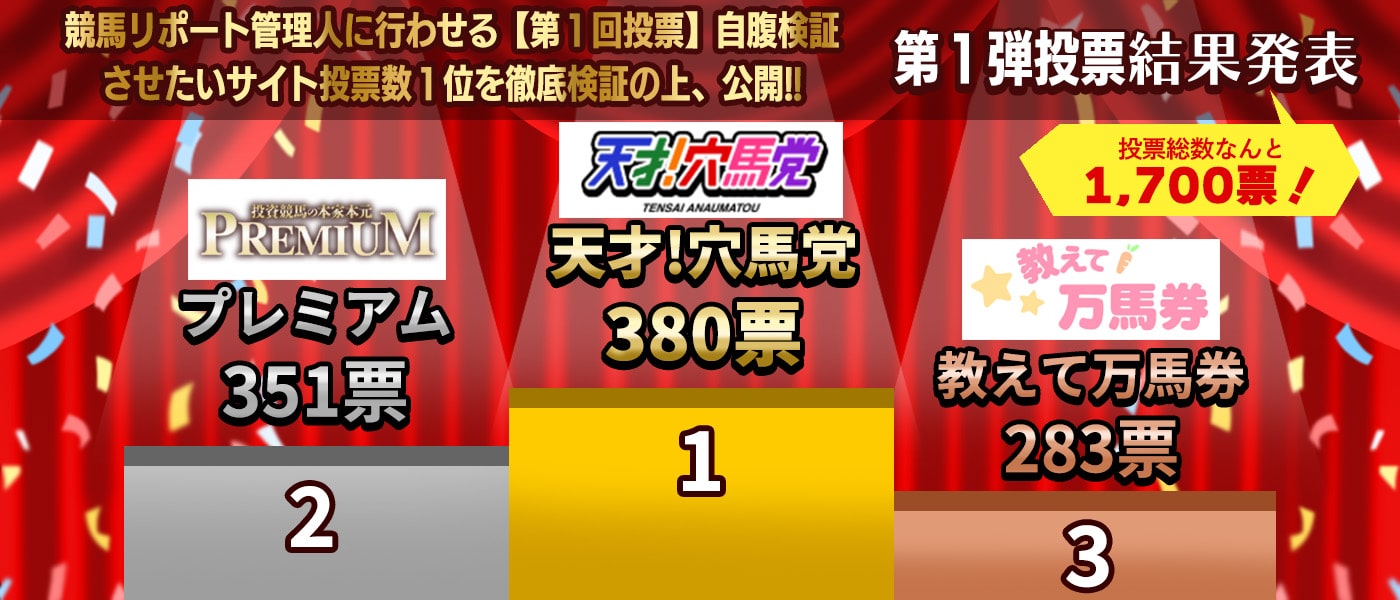 5日間にわたり投票を受け付け、堂々の1位になったのは380票の「天才!穴馬党」です!