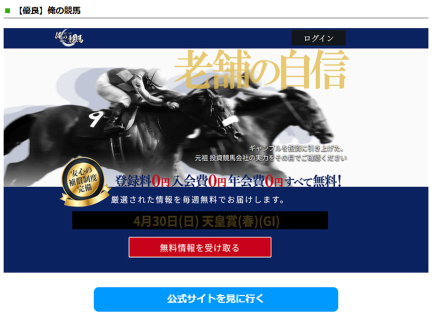 ぜひこちらから【俺の競馬】の口コミページへ飛ぶことができますので、口コミを見てご登録へ進んでください。