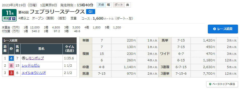 ⑦レモンポップは買い目に入っていたものの⑮レッドルゼル、⑥メイショウハリオは入っていなかった為、20,000円が無駄になってしまいました・・・