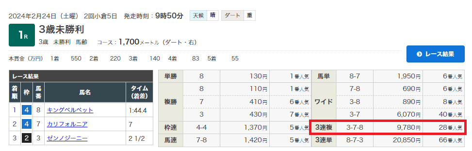 24日(土)朝一小倉1Rで無料情報あと一歩で万馬券となる的中!