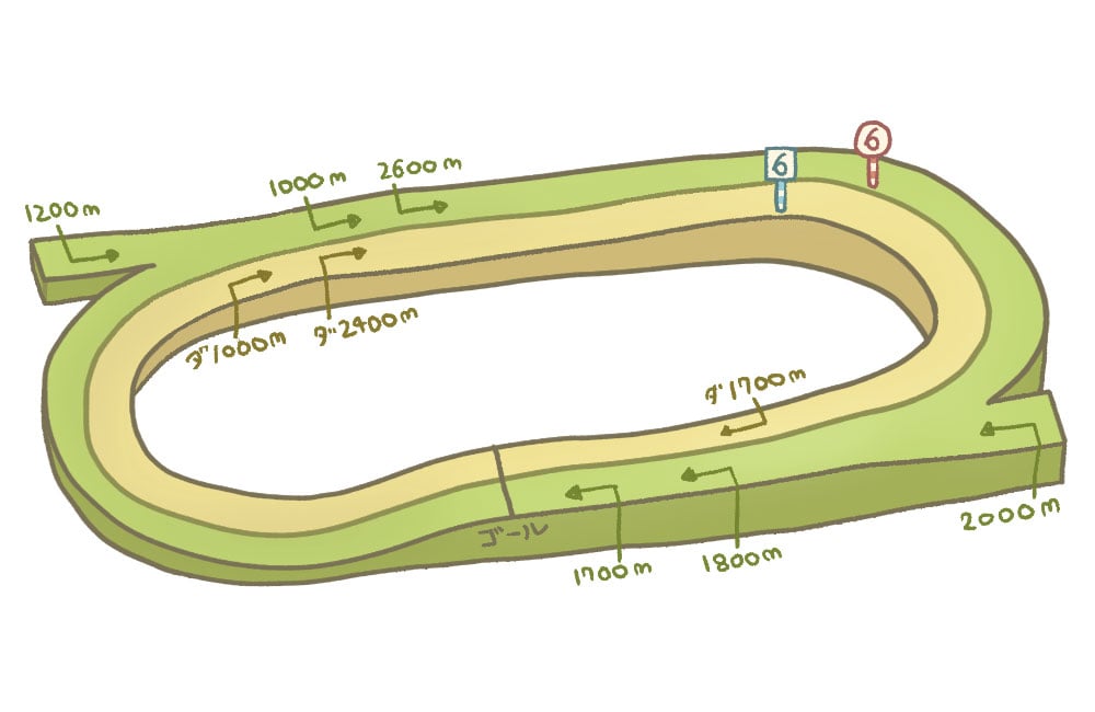向こう正面が上り坂であり、短距離戦ではスタートから上り坂での先行争いとなるため、見た目よりもタフなコース設計なっている。