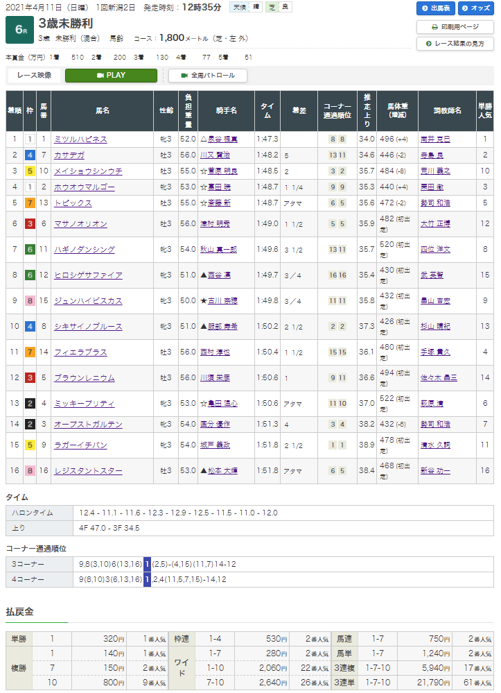 結論からいうと不的中、推奨馬?なのかは定かではないが3連複の軸にしていたマジックキャッスル(2人気)は確かに馬券になったが結果はコチラ。