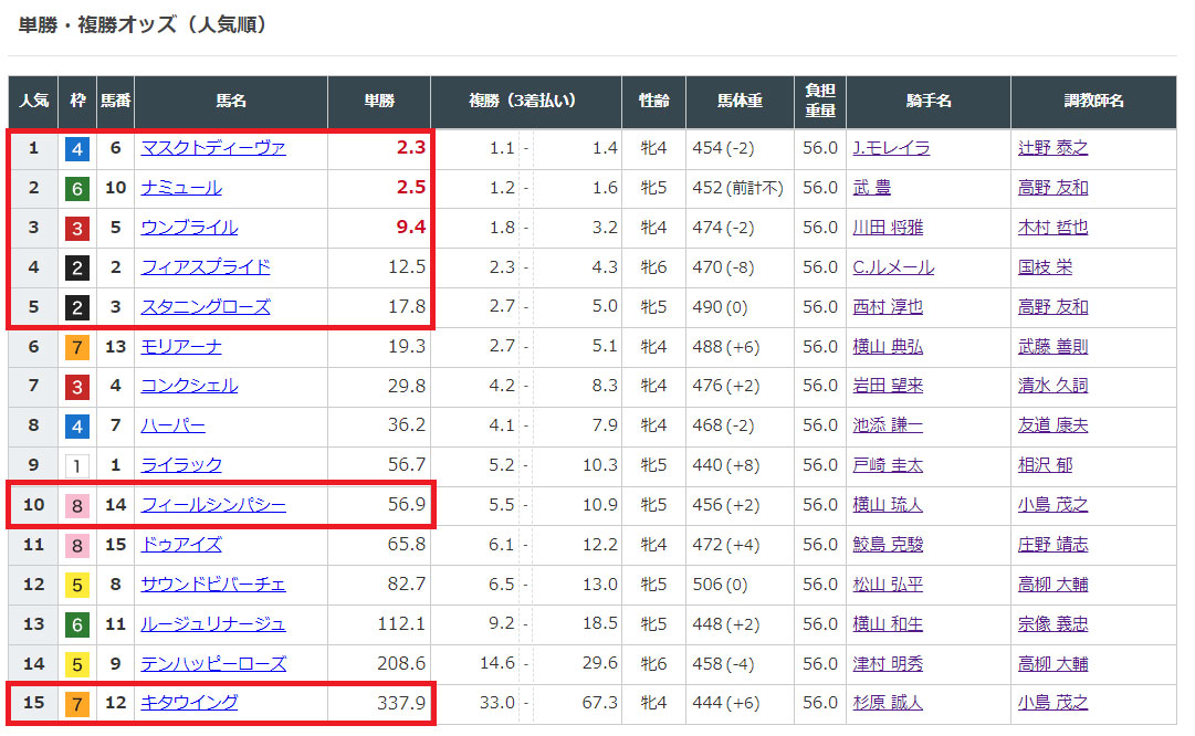 上位人気5頭と10番人気、15番人気の馬を選んでいます。