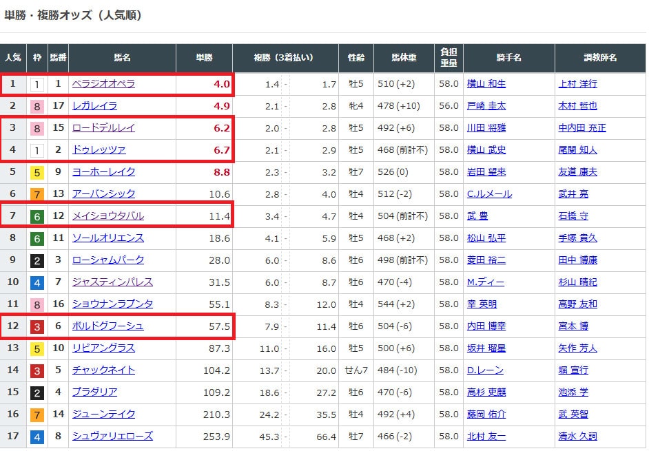 ⑫メイショウタバルは7番人気だったので1番人気のべラジオオペラ相手でも美味しい配当になりました。
