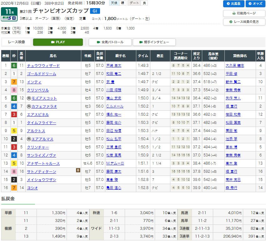 それでは先週のG1チャンピオンズC買い目がコチラ。