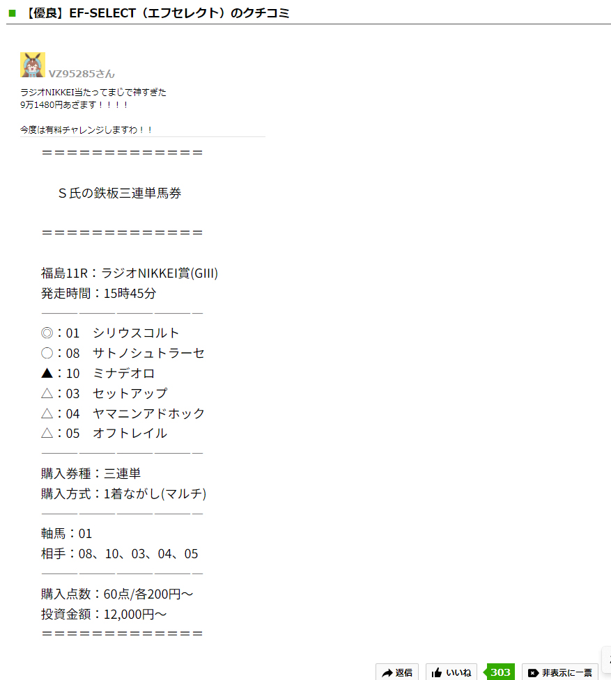 今回【EF-SELECT(エフセレクト)】の【極ウマ】穴馬情報に参加してみましたが、