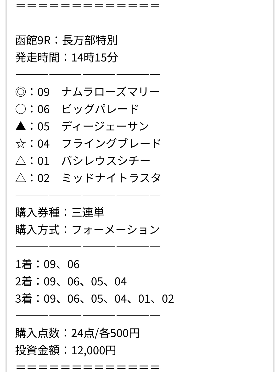 そして気になる日曜日の3つ目に公開された買い目を見ていきましょう。