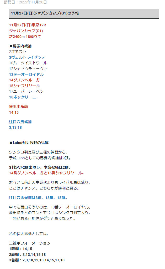 そんな今回は、【競馬予想Labo】というサイトでジャパンカップ前日の土曜日に無料予想が不的中で次の日の無料予想はどうか調べてほしいというご依頼があり検証してみました