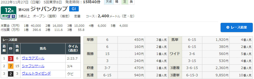 悲しいことに穴馬は馬券に絡まず、1着に買っていた⑭ダノンベルーガは馬券圏外、⑮シャフリヤールは2着で切っていた⑥ヴェラアズールが見事優勝しました。