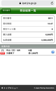 19800円で4週間というコースに参加してます。 2週続けてイマイチだったので、どうかな?と思った矢先… 先週の日曜の新潟2レースで 105万円ですよ! びっくりしました! これからもうまキングさんにお世話になります。