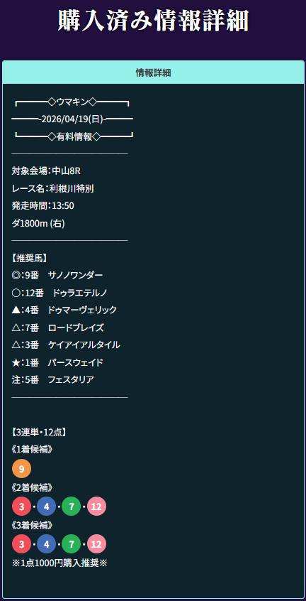 無料で30万円以上勝たせてもらったウマキン。 今回はまじでか?!的中!で9-3-4/30,910円の万馬券的中! 推奨通り馬券購入したから一撃で30万はでけー! 無料情報複数回分の的中が1回でとれた!