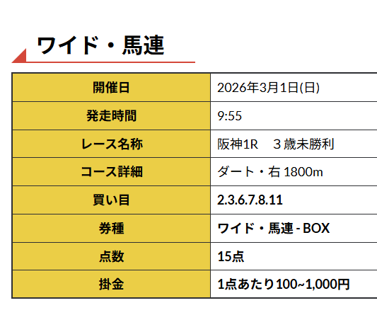 前日の雨が乾ききって無くて翌日の日曜日は重馬場表記でのレースでした。 そんな中公開された阪神1Rの予想は天地ひっくり返ったのかと思う8番人気を 3連単1着目完全固定。 新馬戦7着、未勝利戦も8着と勝ち切れてなかった馬の好走見抜いてました。 芝からダート替わりで勝ち負けあると情報掴んだのでしょうか。 朝から770.1倍(77,010円)的中で61万6080円もの高額入手できました!