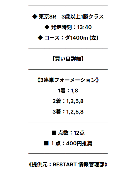 3連単1着流し、◎を軸に相手3頭、6点で無料情報挑ませてもらいました。 配当は万馬券割れだったけど6点、1点千円で80.3倍→8万3000円払い戻しなら上出来の結果ですね!