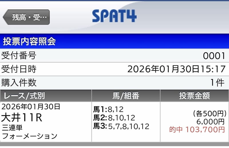 6千円の馬券代が10万越え、立派な成績だと、考えています。