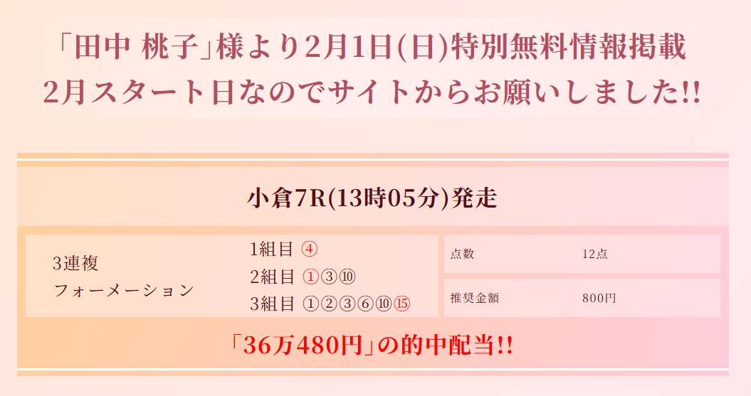 今日初めて登録してサイト内色々見てたけど、先週の中央無料予想で36万払い戻しだと?!